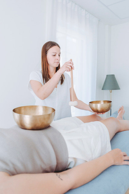 Bei der Klangschalenmassage werden die Klangschalen auf den bekleideten Körper gestellt und dann mit einem Filzschlägel angeschlagen. Dabei entstehen harmonisierende Klänge, die als sanfte vibrierende Schwingungen im gesamten Körper gefühlt werden.